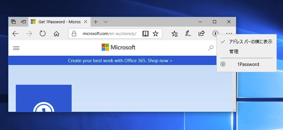 拡張機能をインストールするとEdge上の右上に1Passwordアイコンが表示され、1Passwordの各種パスワード管理機能をEdigeから素早く利用できるようになります。IDやパスワードの自動入力機能や、ランダムパスワードの生成機能も利用できます。