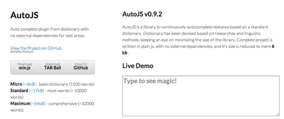 「AutoJS」はテキストエリアで辞書ベースの自動補完を行えるようにするためのライブラリです(GitHub)。