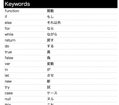 JavaSriptベースのプログラミング言語だそうですが、これを使えば、「if」のかわりに「もし」、「else」のかわりに「それ以外」といった自然な表記を使えるようになります。個人的にif、elseは一回覚えればどんなプログラミング言語でも使い回せるのに対し、日本語はつぶしがきかないのでお勧めできませんが、日本語の表記一覧を見てるとジワジワきました。