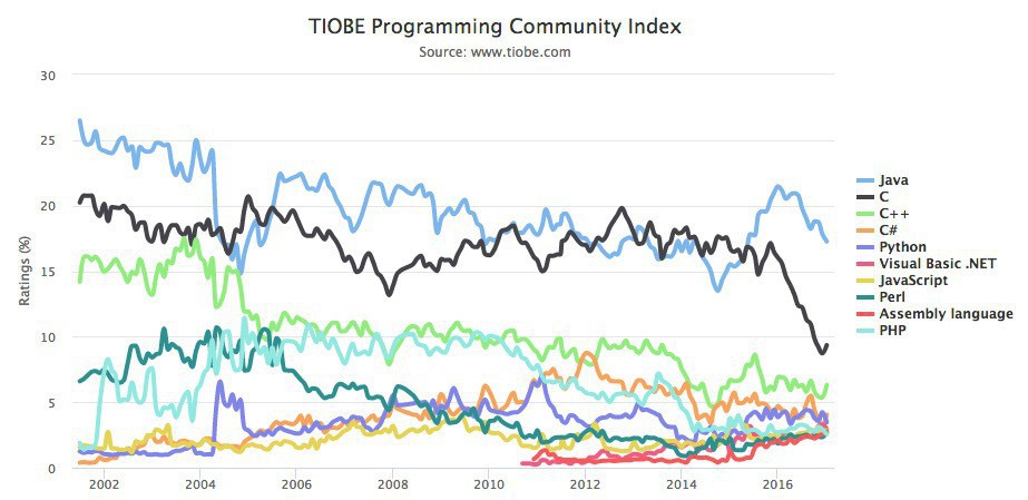 プログラミング言語の人気の指標であるTiobe Indexでも、2002年にはC/C++の合計が35%であったのに対し、2017年には20%以下と長期的な下落傾向にあると指摘しています。