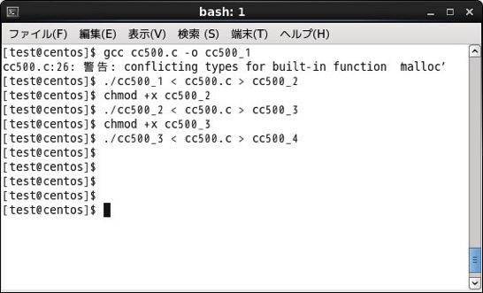 生成された実行ファイル「cc500_1」を使って、自分自身のソースコード「cc500.c」をコンパイルすることができます。