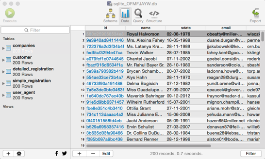 companies、customer、detailed_registration、simple_registration、user_agentという5つのテーブルが作られ、それぞれ200行ずつレコードがINSERTされていました。実際のデータも、名前、emalアドレス、電話番号などそれっぽいものが入っていました。