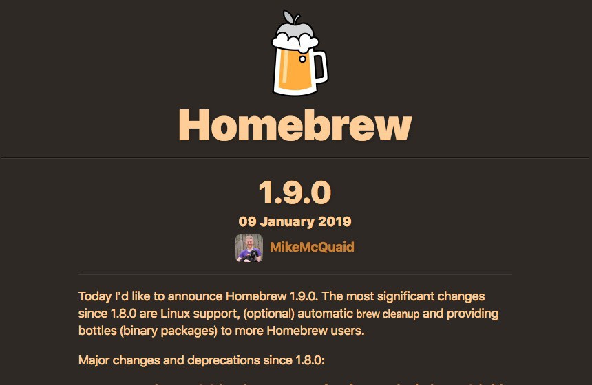 v1.9.0ではLinuxのベータサポートの追加や、自動brew cleanup機能の追加、bottle(binary package)の提供範囲の拡大などの新機能が追加されています。