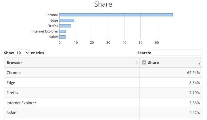 Chromium Edgeのシェアは8月の8.52%から9月の8.84%に順調に増加しています。昨年の同時期のEdgeのシェアは5.38%だったため、1年かけて3.46%シェアが増加したことになます。Chromeのシェアは69.94%と他を圧倒していますが、Edgeが今年3月にFirefoxから2位の座を奪い、その後も2位を維持しているのは注目に値するといえそうです。