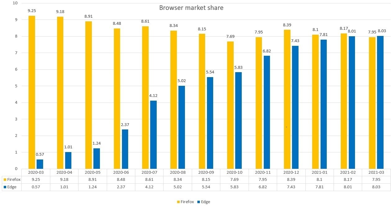 FirefoxとEdgeのシェアを比較したグラフを確認すると、Edgeのシェアの増加は、Forefoxのほかにも、Google Chromeや、Internet Explorerからもたらされたものである可能性があります。
