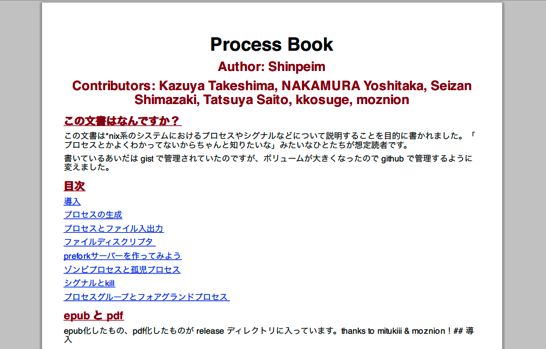 同ドキュメントは、プロセスの生成、プロセスとファイル入出力、ファイルディスクリプタ、preforkサーバーの作り方、ゾンビプロセスと孤児プロセス、シグナルとkill、プロセスグループとフォアグランドプロセスといった話題を解説するドキュメントで、GitHubのreleasesディレクトリにはPDF、epub形式のファイルも格納されています。