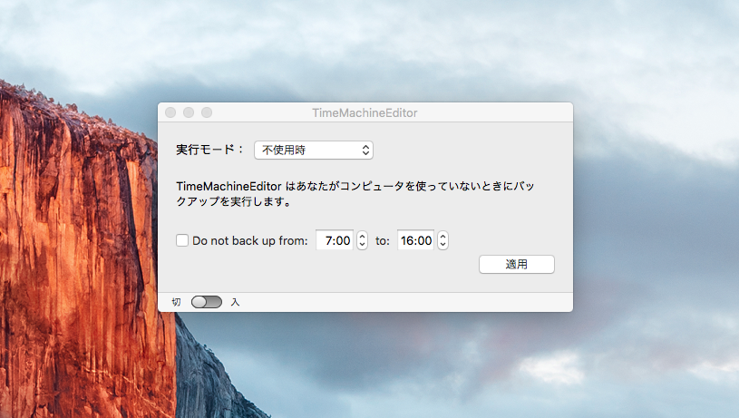 | 説明 | TimeMachineのバックアップ間隔を変更するためのソフトウェア。 |