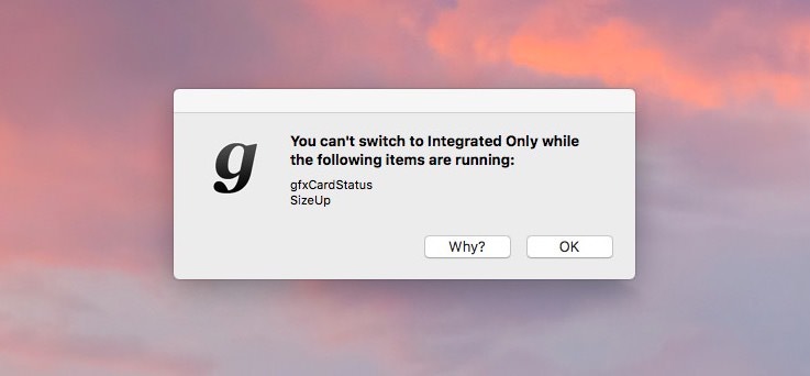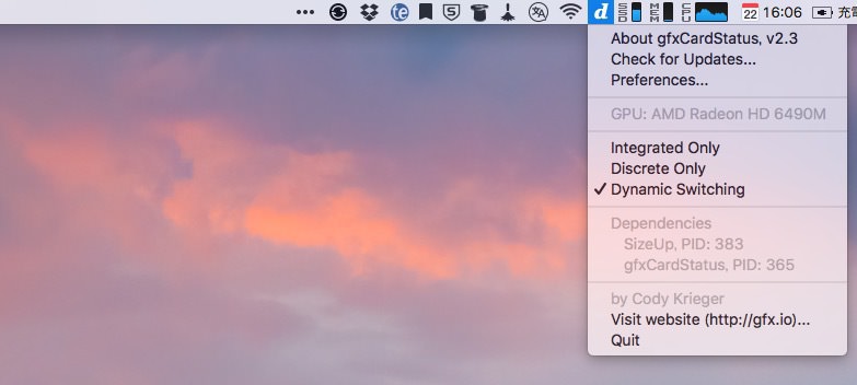 ところがmacOS SierraではgfxCardStatus自体が、外部GPUに依存したプログラムとみなされ、gfxCardStatusを起動するだけで外部GPUが使われるようになっています。