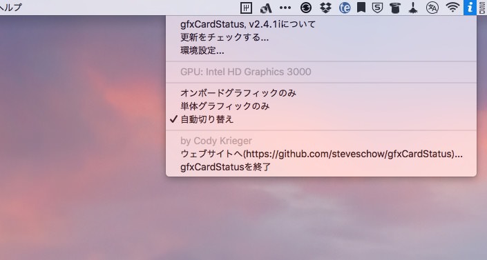 ▲fork版のバージョンはgfxCardStatus v2.4.1。依存リストからgfxCardStatusが消え、内蔵GPUで動く事が確認できました。