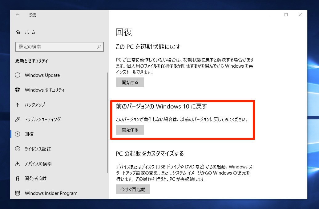 ▲「回復 > 前のバージョンのWindows 10に戻す」の下にある「開始する」をクリックします。