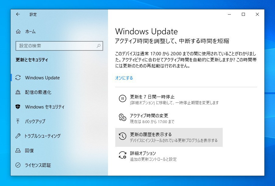 ▲「設定 > 更新とセキュリティ > Windows Update」を選択し、上から3番目のメニューである「更新の履歴を表示する」をクリックします。