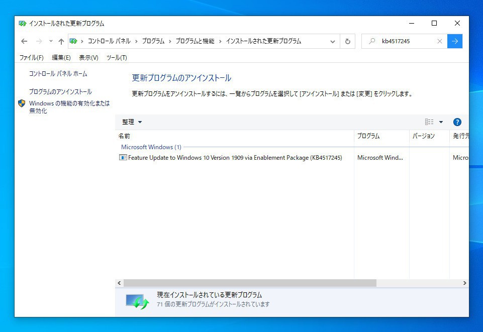 ▲「更新プログラムのアンインストール」画面が表示されたら、右上の検索ボックスに「KB4517245」を入力して検索します。表示された「Feature Update to Windows Version 1909 via Enablement Package(KB4517245)」をダブルクリックしてアンインストールし、再起動します。
