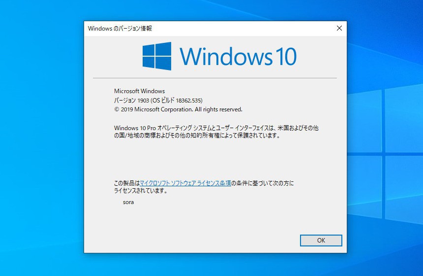 ▲タスクバーの検索ボックスやWin+Rを利用し「winver」を実行します。「バージョン 1903」と表示されていたらダウングレード成功です。