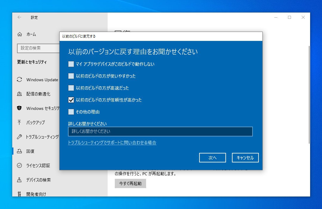 ▲「以前のバージョンに戻す理由をお聞かせください」では、以前のバージョンに戻す理由を選択します。適切な項目にチェックを入れて「次へ」をクリックします。