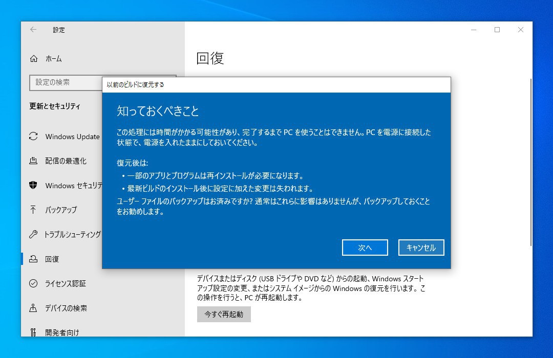 ▲「知っておくべきこと」では注意事項が表示されます。処理に時間がかかる可能性があること、復元後に一部のアプリとプログラムは再インストールが必要になること、最新ビルドのインストール後に加えた設定が失われること、バックアップをとっておいたほうが良いことなど、いくつかの注意点が掲載されています。