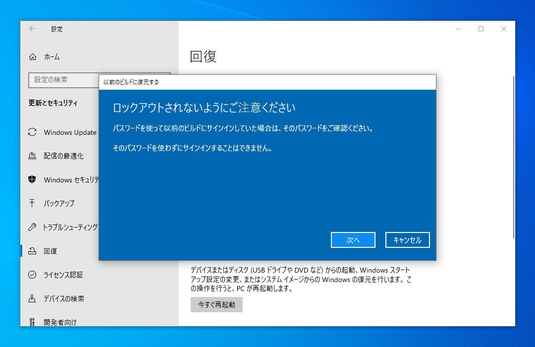 回復機能を利用すれば以前のWindows 10のバージョンに簡単に戻すことができます。ただしアップグレード後10日間に限って実行できる機能ですのでソフトやハードのテストは最初にまとめて実行しておくのがおすすめです。