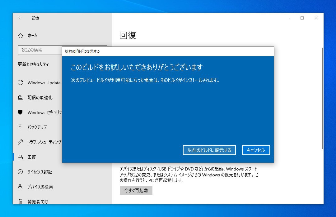 ▲「このビルドをお試しいただきありがとうございます」では最後の確認を行います。「以前のビルドに復元する」をクリックすると復元処理が始まります。
