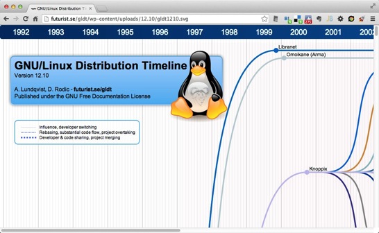 「GNU/Linux Distribution Timeline」は、1992年に公開された世界最初のLinuxディストリビューション「SLS」以来の、膨大なLinuxディストリビューションの歴史を年表形式で表したものです。(ソースコード、Hacker News)。