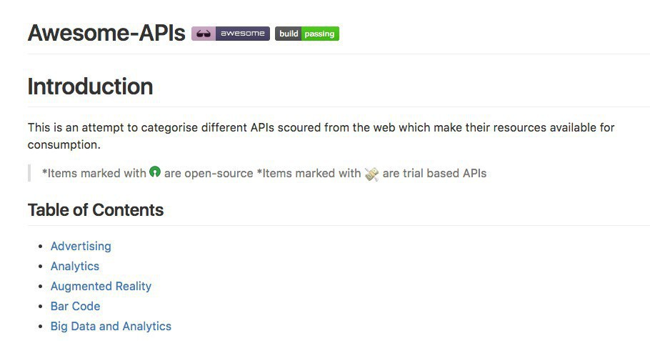 本日紹介する「Awesome-APIs」はこのAPIを分類整理したリスト集。数え切れないほどのAPIがカテゴリごとに分類されてまとめられています。