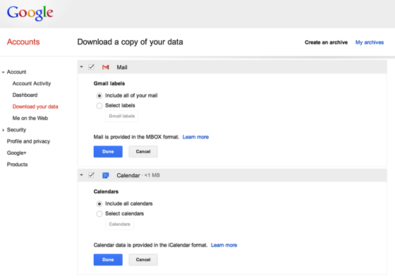 GmailとGoogleカレンダーのデータが正式にダウンロード可能になる事が明らかにになりました(Official Gmail Blog)。
