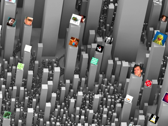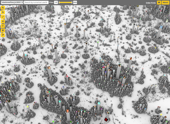 A graph layout algorithm arranges users in 2D space based on their similarity. Cosine similarity is computed based on the users' network (Friendfeed), collaborate, watch, fork and follow relationships (Github), or based on the tags of posts contributed by users (StackOverflow). The height of each user represents the normalized value of the user's Pagerank (Github, Friendfeed) or their reputation points (StackOverflow).