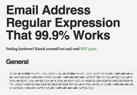 一見Emailアドレスにマッチする正規表現を組み立てるのは簡単そうに思えますが、RFC 5322に厳密に準拠した正規表現を創りだそうとするととんでも無い努力が必要となるようです。