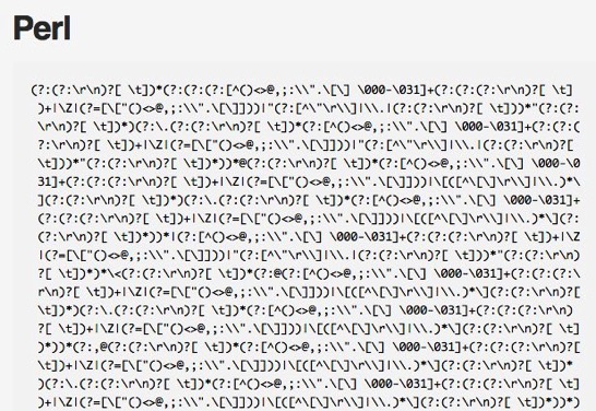 「Email Address Regular Expression That 99.9% Works」は、様々なプログラミング言語ごとに、Emailアドレスに99%マッチする正規表現を掲載したサイトで、例えばPerl 5.10より前のバージョンのPerl用として、掲載されている長大な正規表現を見れば、その難易度の高さを確認することができます。