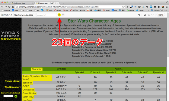 実際にデータを抽出してみましょう。公式ブログ「Never write a web scraper againで使われているスターウォーズのサンプルが分かりやすいです。