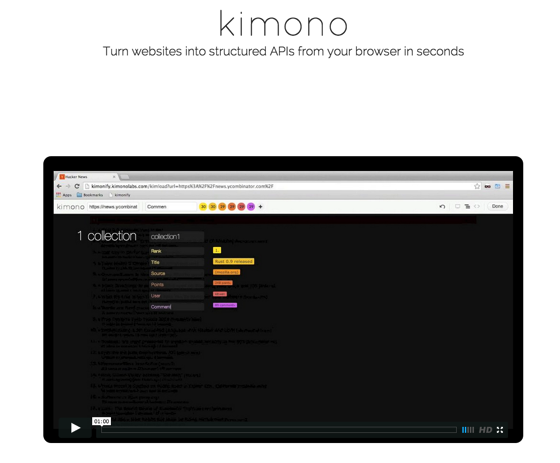 Webスクレイピングとは、Webサイトから情報を抽出するソフトウェア技術のこと。通常サイトごとにちまちまとプログラムをつくる必要がありますが、現在ベータ中のサービス「kimono」は凄い。ブラウザを使ってクリックするだけで、WebサイトからJSON/CSV形式でデータを抽出する事ができます。