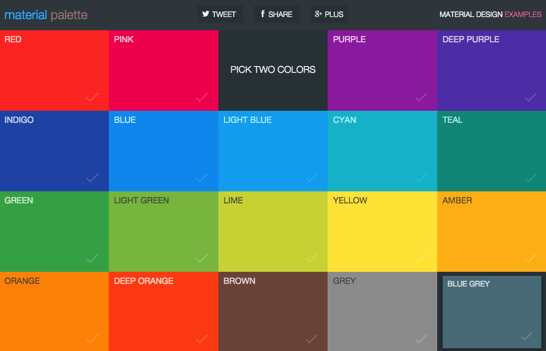 「Material Palette」はそんな苦労をちょっぴり軽減してくれるWebサービスです。その名の通り、マテリアルデザインっぽいカラーパレットを生成してくれるサービスで、使いたい色を2色選択するだけで使えます。