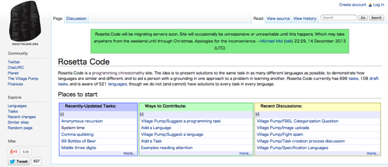 「Rosetta Code」は、「いろいろなタスク(例題)を、様々なプログラミング言語で書いたらどうなるか」を比較できるプログラミング言語の名句集サイトです。