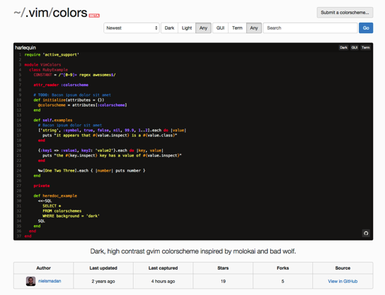 メジャーなエディタを使う利点の一つに、さまざまな拡張機能や、テーマが存在することがあげられるかもしれません。本日紹介する「Vim Colors」は、Vimユーザーのためのカラースキーム検索サイトです。Vimは世界屈指の人気エディタなので、なんと全231個ものカラースキームを検索することができます。