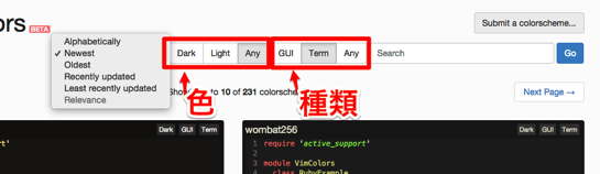 画面上部で、色や(Dark系 or Light系)、種類(GUI or ターミナル)を指定したり、文字列を使って絞り込むことができます。