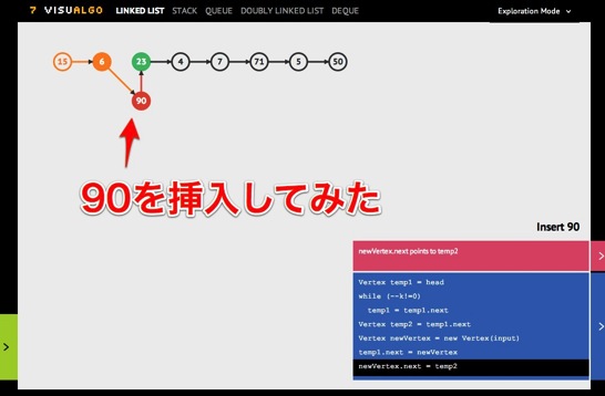 例えば「Insert」を選んで、2番目の要素の後に90をいれるとこのように表示されます。Linked Listに値を挿入するためには、頭から要素をたどっていく必要があることがよく分かります。