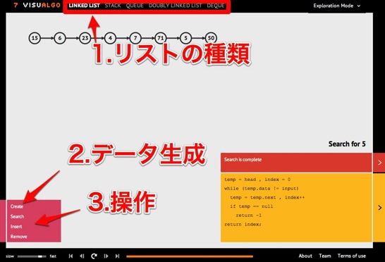 試しにもう一つリストアルゴリズムを試してみました。ここでは、Linked List、Stack、Queue、Double Linked List、Dequeといったおなじみのデータ構造に対して、検索、挿入、削除など基本的な操作を実行する様子を観察することができます