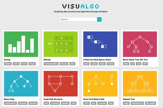 VisuAlgoは、アルゴリズムを学習する際に頭の中で考えたり、紙で再現したりする手間を減らしてくれる有益なサイトだと思います。取り上げられているアルゴリズムもソートやサーチといった基本的なものばかりでなく、Suffix Array / Suffix Treeのような最近注目されているアルゴリズムまでカバーしていて有用度が高そうです。