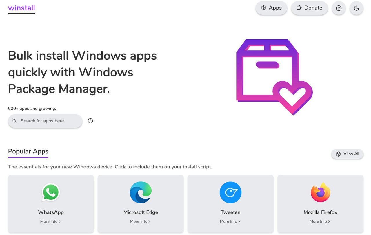 WinstallはWindows Package Managerに含まれるアプリをブラウズし、インストール用のコマンドを作成する機能を提供します。