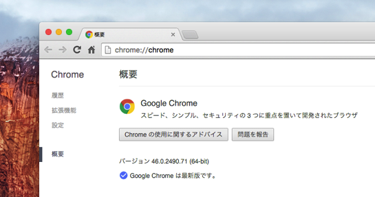 Googleは10月13日(現地時間)、Windows / Mac / Linux用のWebブラウザ、Chromeの最新安定版「Chrome 46」をリリースしました(Chrome Releases、窓の杜)。現在Chromeの自動更新機能を使って、または「Chrome > Chromeについて」より最新版に更新することができます。