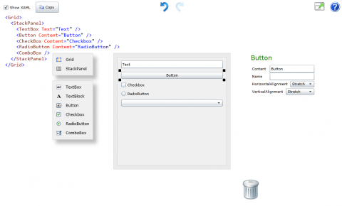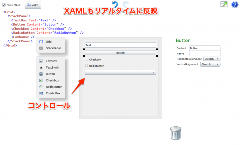 左側のコントロールを選んで真ん中にドロップすれば一応画面のレイアウトっぽいものを作ることができます。一応と書いたのは、Grid、StackPanelのオプション指定なんかが部分的にしか指定できないので複雑な画面を作ることができないからですね。ソースが改良されているので改良にチャレンジすることはできると思いますが。