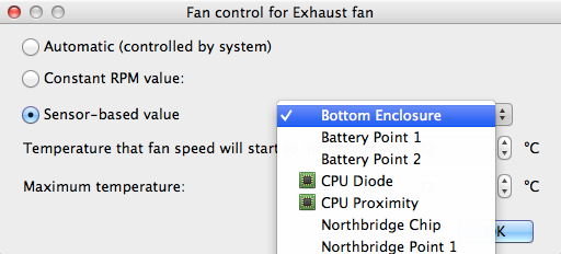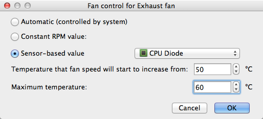 「Temperature that fan speed will start to increase form」はファンが回転数を増やし始める温度。「Maximum temperature」は最大の温度。例えば、CPU Diode 50度〜60度を設定した場合、CPU温度が50度に到達したときにファンの回転数が増え始め、60度になると最大回転数になるのだと思います。このへんPCのBIOS設定なんかでもお馴染みの考え方ですよね。