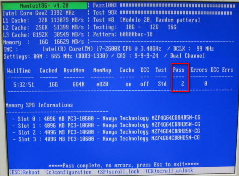 結果メモリの不具合はありませんでした。なぜブルーバックになって落ちたのか根本的な原因は不明のままですが「メモリの不良ではない」と原因を切り分けることができました。メモリは可動部分がないのでHDDなどと比較すると壊れにくい部品だと思いますが、なんとなく動作が不安定な時に「Memtest86+」を使ってメモリチェックすると安心できると思います。