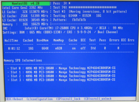 最近デスクトップPC(Windows 7 64bit)がブルーバックになって落ちることが数回ありました。今までWindows 7はかなり安定して使えていたので、落ちるとするとハードウェアの不具合が考えられます。この前8GBのメモリを16GBに増設したばっかりだったこともあり「Memtest86+」を使ってメモリの不具合をチェックすることにしました。