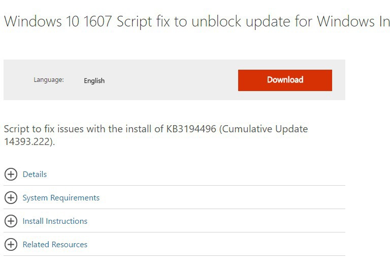 スクリプトの説明には「Script to fix issues with the install of KB3194496 (Cumulative Update 14393.222)」と簡単な説明があり、KB3194496がインストールできない問題を修正するスクリプトであることがわかります。