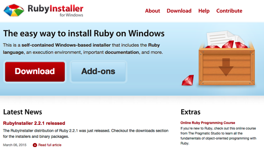 プログラミング言語RubyのWindows用バイナリ「RubyInstaller」の最新版「RubyInstaller 2.2.1」が3月6日(現地時間)、リリースされています(News)。現在公式サイトより、32bit版/64bit版それぞれのインストーラーをダウンロードすることができます。