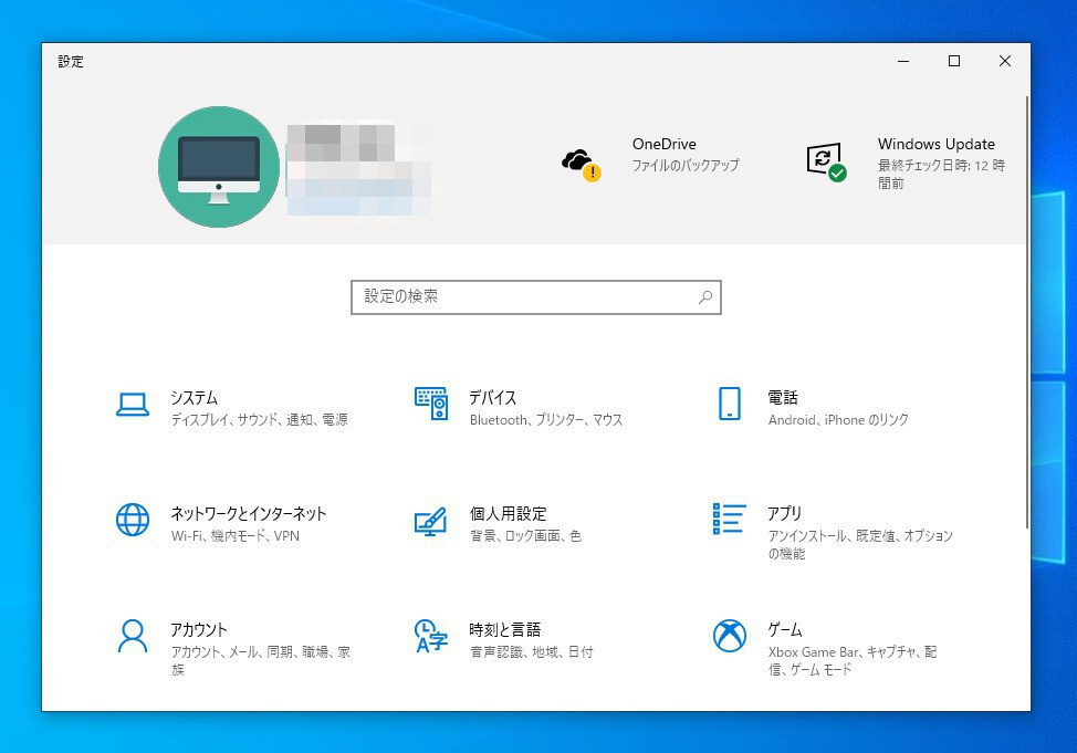 新しい設定画面のデザインでは、画面の上部にユーザー情報のほか、OneDrive、Windows Update、Your Phone、リワード(プレビュー版の場合)などの各種情報が表示されます。