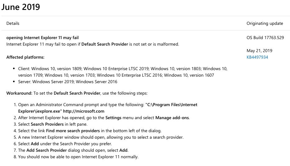 Windows 10 Version 1809用の最新の累積アップデートKB4497934などに、Internet Explorer 11が開けなくなる既知の不具合が存在することがわかりました(AskWoody)。