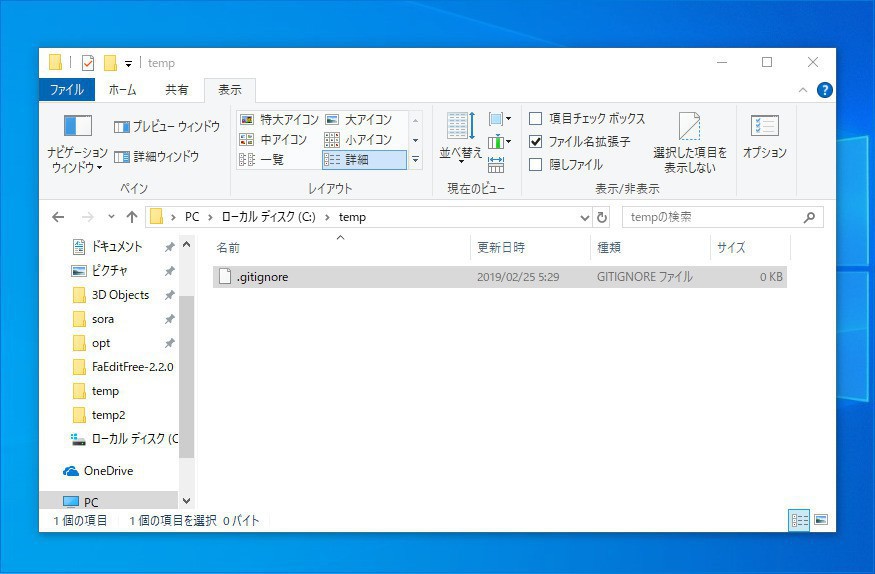 実際に「.gitignore」で確認してみたところ、Windows 10 Version 1809では「ファイル名を入力してください」とエラーが表示されますが、Windows 10 Version 1903のプレビューブルドでは「新規作成 > テキストドキュメント」から名前を変更することで作成可能でした。