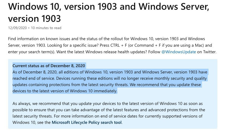 Windows 10の機能アップデートは好みのタイミングでインストールすることができますが、サポート期間の終了が近い場合は別で、Windows Updateにより自動的に最新の機能アップデートが適用されます。Version 1903を実行しているデバイスは強制アップグレードの対象になると思われます。