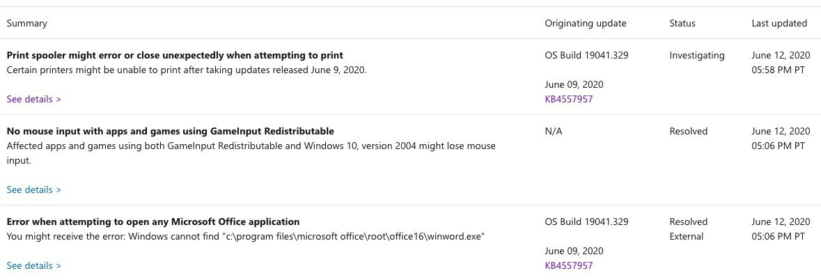 MicrosoftがWindows 10の既知の不具合をまとめたWindows Release Informationページを更新し、最新のVersion 2004などに影響する3つの既知の不具合を追加した事がわかりました(gHacks)。