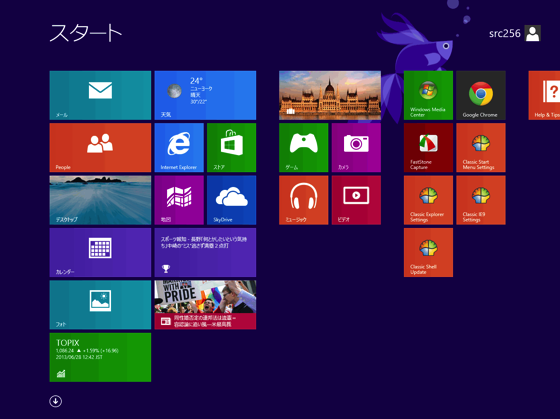 Windows 8.1で一番期待されていたスタートメニューの復活は事前リーク情報の通りありませんでした。デスクトップ画面左下に、Windowsロゴのいかにもそれっぽいボタンが表示されていますが、これをクリックしても「スタート画面」に切り替わるだけ(ちなみに右クリックすると一応スタートメニューの超サブセット的なメニューが表示されます)。